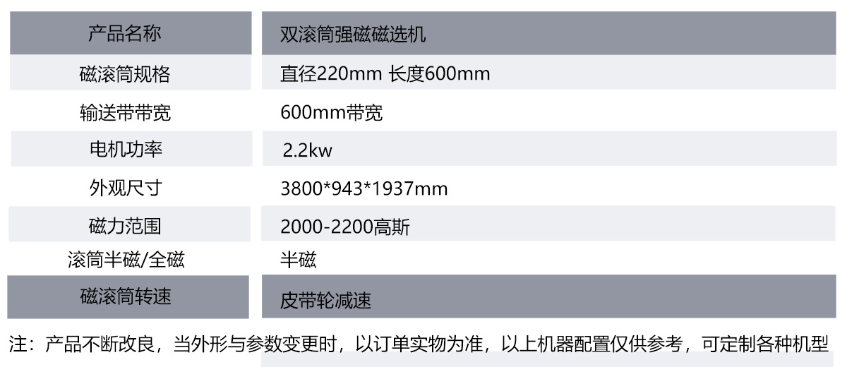 雙滾筒強(qiáng)磁磁選機(jī)與常規(guī)雙滾筒磁選機(jī)相比,磁系結(jié)構(gòu)增加,加上入料輸送機(jī),出料輸送機(jī),工作更加便捷。