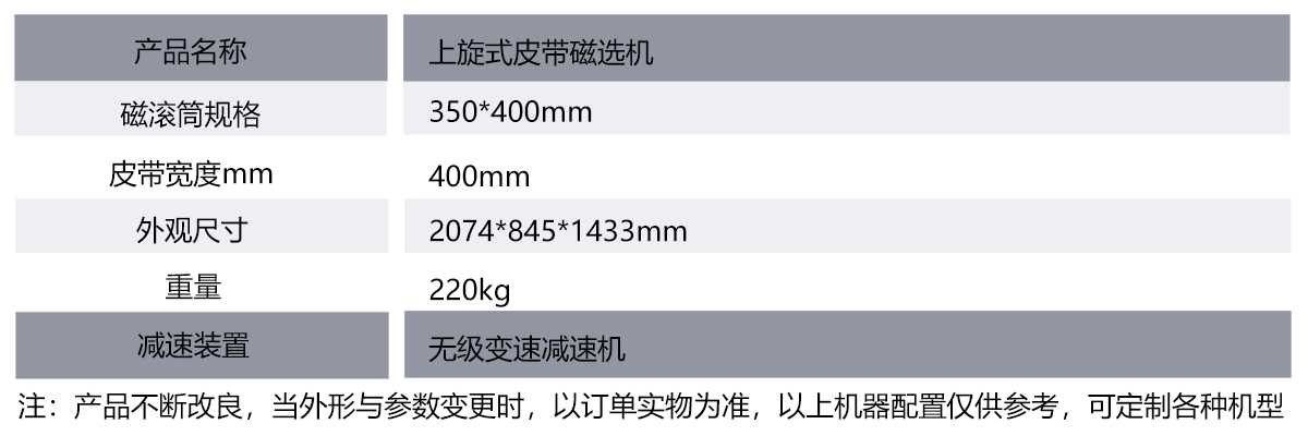- 上旋式皮帶磁選機(jī)?由磁滾筒、機(jī)架、減速機(jī)、皮帶、從動輥、皮帶罩等組成,物料經(jīng)過皮帶入料后,非磁性材料順著皮帶從側(cè)面脫落到地面或者可以接噸包,磁性材料則經(jīng)過上旋式皮帶到上面的皮帶后,再從鐵出口出來,這樣就達(dá)到了磁性材料和非磁性材料的分離??筛鶕?jù)客戶需求定制,結(jié)構(gòu)合理,方便好用。